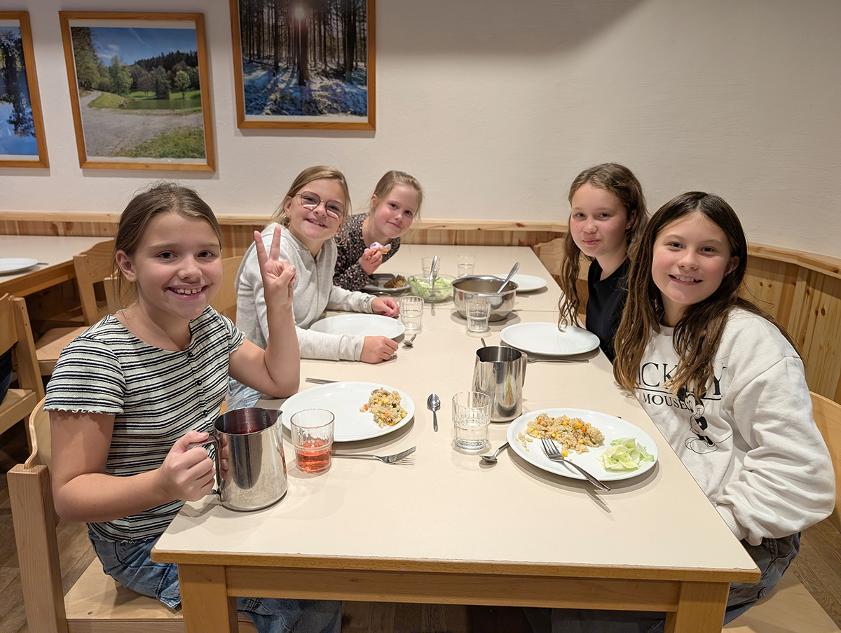 Gleich zu Beginn des neuen Schuljahres verbrachte die Klasse 5b vom 24. bis 26. September 2025 gemeinsam mit ihrer Klassenlehrerin Frau Denecke und ihrem Musiklehrer Herrn Borho unvergessliche Kennenlerntage im Schullandheim Hobbach. Schon die Busfahrt dorthin war voller Vorfreude und Aufregung. Vor Ort wartete ein abwechslungsreiches Programm, das nicht nur für viel Spaß, sondern auch für ein gutes Miteinander sorgte. Im Rahmen einer Schullandheimrallye erkundeten die Schülerinnen und Schüler das Gelände und stellten dabei ihren Teamgeist unter Beweis. Besonders interessant war auch das Projekt „Fließgewässer“: Mit Sieben und kleinen Plastikgefäßen wurden Tiere aus dem Bach gefangen. Anschließend konnten sie mit Lupen genauer betrachtet und gezeichnet werden. Dabei entdeckten die Kinder unter anderem Eintagsfliegenlarven, Köcherfliegenlarven und Bachflohkrebse – ein Erlebnis, das den Unterricht lebendig machte. An einem der Tage stand eine Wanderung nach Heimbuchenthal auf dem Programm. Ziel war die „Pedalwelt“, wo zahlreiche außergewöhnliche Fahrräder ausprobiert werden konnten. Dabei hatten alle viel Spaß. Auch die Musik kam nicht zu kurz: Als Bandklasse musizierten die Kinder gemeinsam, probierten verschiedene Instrumente aus und sangen zusammen. Dadurch wuchs das Gemeinschaftsgefühl noch stärker. Am Ende waren sich alle einig: Diese Tage in Hobbach haben nicht nur neue Freundschaften entstehen lassen, sondern auch gezeigt, wie schön Lernen außerhalb des Klassenzimmers sein kann.