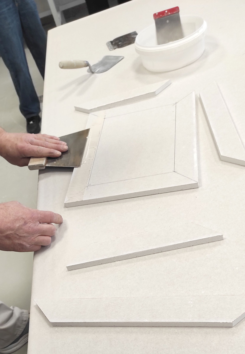 2. Feinschliff und Struktur: Nach dem Schleifen der Kanten wurde Spachtelmasse fachgerecht mit Aufzahn- und Japanspachtel aufgetragen.