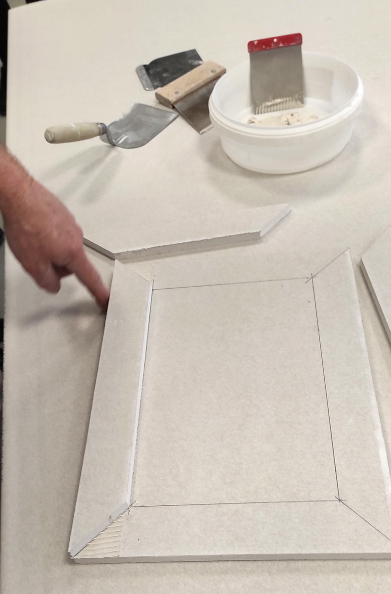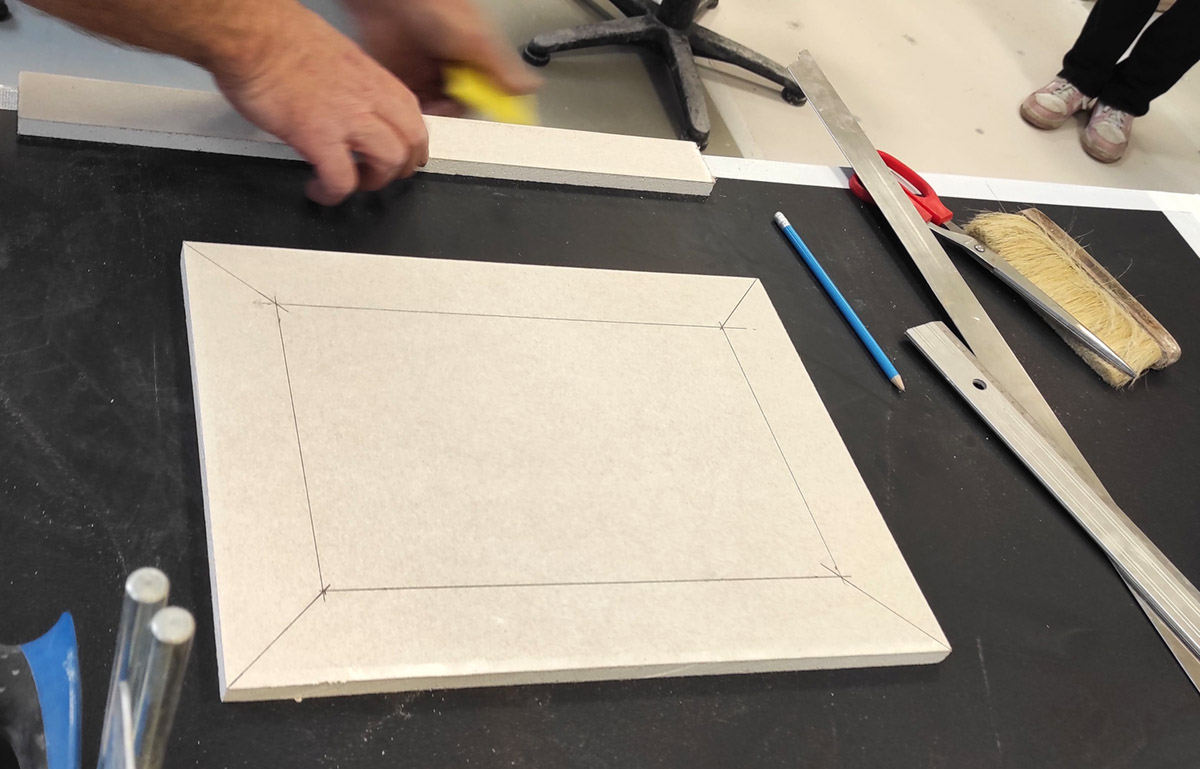 1. Vorbereitung: Aufzeichnen der Außenmaße und präzises Zusägen der Leisten auf Gehrung an den Sägevorrichtungen.