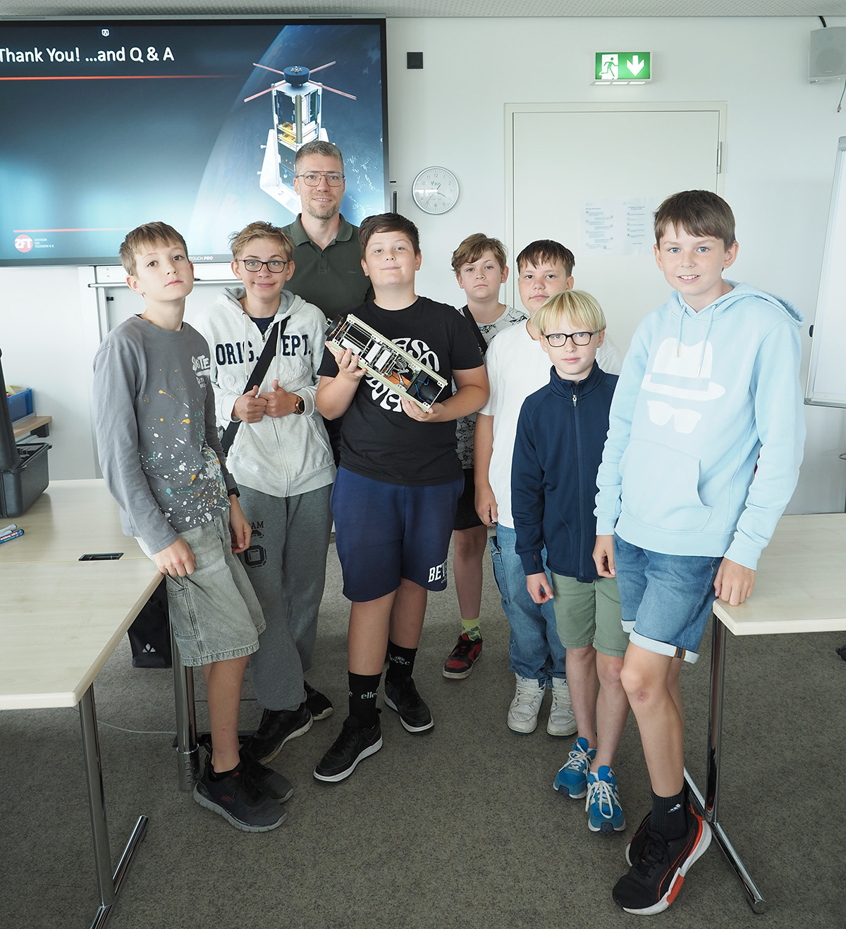 Im Zentrum für Telematik am Hubland erhielten die Schüler spannende Einblicke in aktuelle Forschungs- und Entwicklungsprojekte. Während einer rund 120-minütigen Führung durch den Geschäftsführer Daniel Eck lernten sie, wie Kleinsatelliten entwickelt werden und wie diese zur Erdbeobachtung eingesetzt werden. Besonders beeindruckend war, dass die Informationen direkt von den dort tätigen Ingenieurinnen und Ingenieuren vermittelt wurden – anschaulich, praxisnah und auf Augenhöhe. Das Highlight: die Schüler hatten die Gelegenheit einen echten Satelliten in der Hand zu halten, dessen baugleicher Bruder bereits im Weltall kreist. Eine einmalige Erfahrung bei Stückkosten im mittleren Millionenbereich.