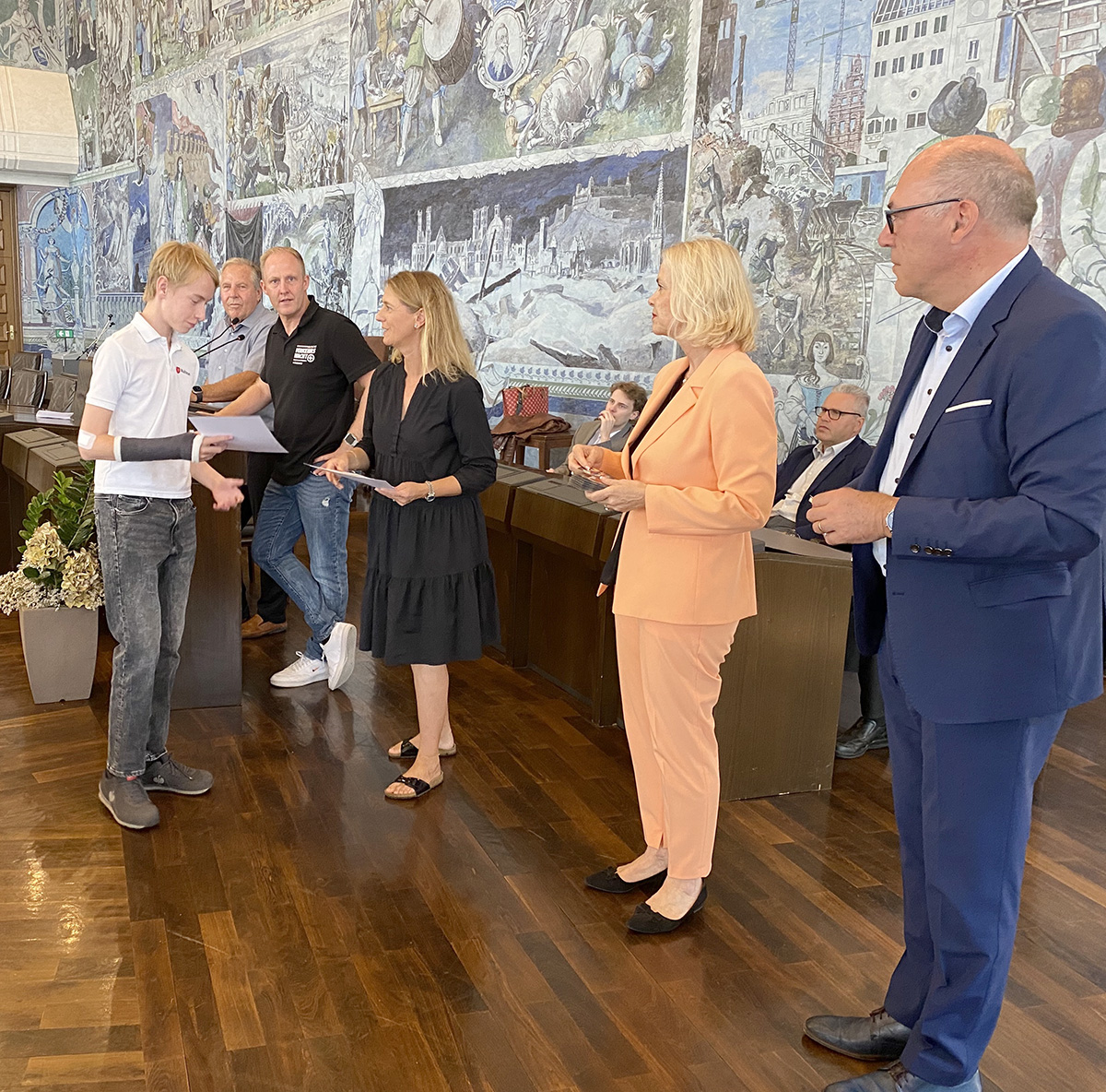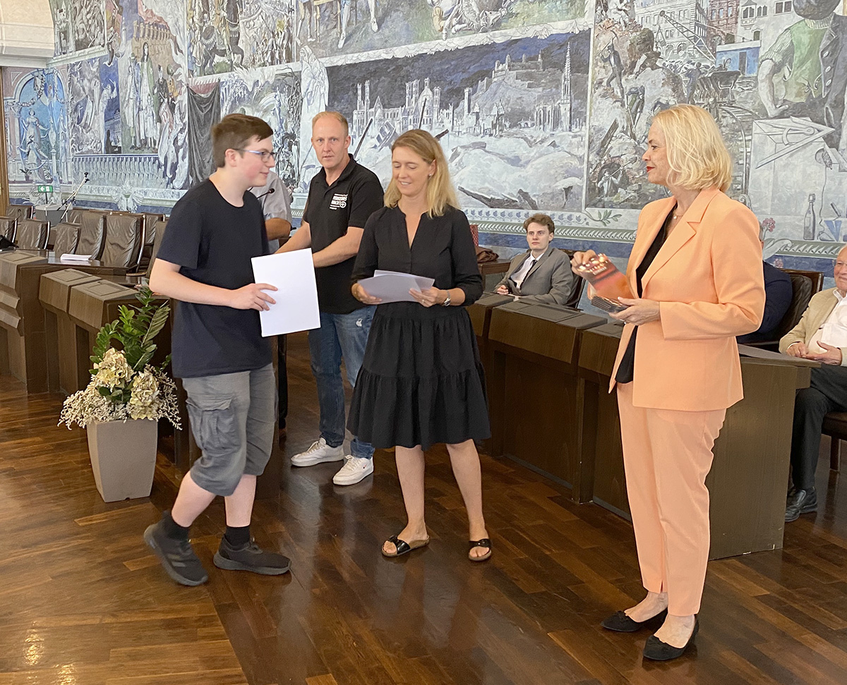 Sirius Schnabel, Julian Stumpf und Emil Schützwohl nahmen an der Verabschiedung im Rathaus teil und vertraten damit die Stoll.