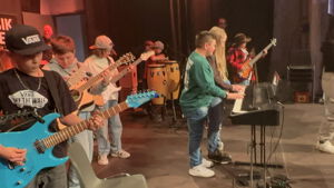 Die Bandklasse 5d hatte mit „Bullet“ einen Titel von Ayliva einstudiert und präsentierte beide Stücke in einem anspruchsvollen Mashup mit vielen Breaks und Übergängen. (Bild Bandklasse 5d Nürnberg) Die Bandklasse 6c war mit „Supermodel“ von Maneskin am Start und begeisterte die anwesenden Schüler und Musiklehrkräfte durch mitreißende Ansagen, Riffs, Breaks und einem erstaunlich sicheren Vortrag. Bemerkenswert war, dass besonders der Klassiker „Sunshine of your love“ die Halle zum Tanzen brachte.