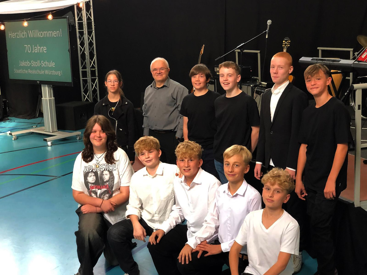 Am 11.5. fand der bayernweite Wettbewerb „rock-im-puls“ wieder im Technikum München statt. Auch die Bands der Jakob-Stoll-Schule Würzburg unter der Leitung der Musiklehrer Ralf Borho und Verena Wendel waren nach der langen Corona-Zwangspause wieder mit dabei, natürlich in der Hoffnung eventuell an die Erfolge früherer Jahre anknüpfen zu können. Die Bandklasse 5c trat mit ihrem anspruchsvollen Arrangement von „Pokerface“ an. In den wenigen Wochen seit Schuljahresbeginn konnten schon zweistimmige Gitarrensoli (Emil Kunz und Vinzenz Wiertelok), anspruchsvolle Basslines (Julius Kräml) und Drum-Breaks (Jan Weigel und Luca Prust) eingeübt werden. Die beiden Sänger Matvej Myronenko und Ben Weigel intonierten sicher und hatten sogar eine Bühnenshow einstudiert.