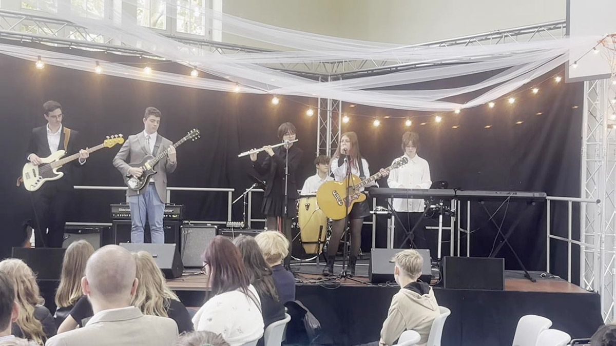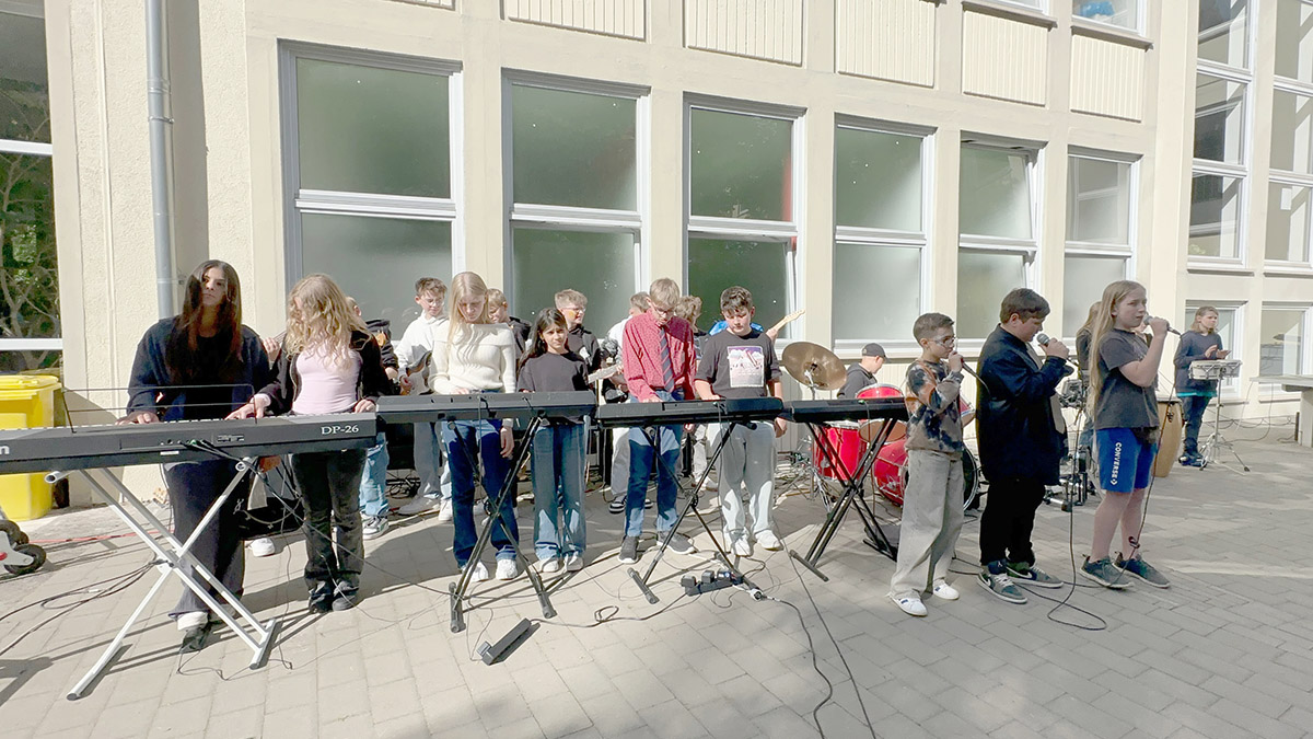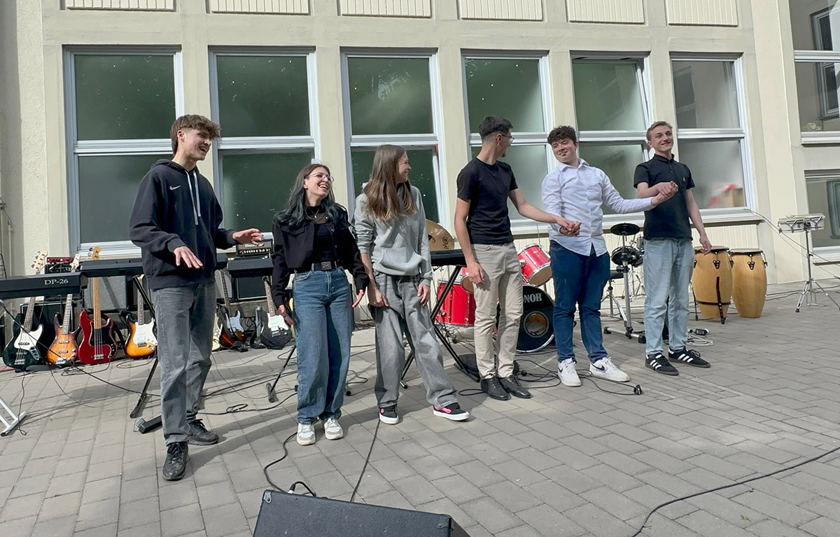 Um der Größe und Bedeutung der Veranstaltung gerecht zu werden, wurden natürlich die besten Bands des vergangenen Schuljahres aktiviert, die Schulband 1 und Bandklasse 6, jetzt Schulband 2. Auf Grund der Kürze der Vorbereitungszeit wurden die alten Hits „Stairway to heaven“ von Led Zepellin, „Ich bin zuhause“ von Tember Blanche (Schulband 1) und „Supermodel“ von Maneskin (Schulband 2) aufbereitet. Der Rock-Klassiker „Because the night“ von Patti Smith kam noch dazu und wurde in gewohnter Weise gekonnt von Olexandra interpretiert und von der Band mit Soli und Breaks verschönert. Die Aufführung schließlich war sehr gelungen und wurde von der anwesenden politischen Prominenz belobigt. Der gelungene Ablauf der Veranstaltung war nicht zuletzt auch der Verdienst von Benni Leberfinger und Jonas Müller unseren alten Schultechnikern, die mit ihrem mittlerweile professionellen Equipment vor Ort waren.